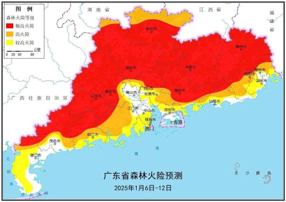 1月6日,广东省应急管理厅发布《一周森林火险趋势分析报告》(2025年1月6日—12日)。该报告指出,本周,我省大部地区以晴朗干燥天气为主,无明显降水天气。当前我省各地正处于冬种备耕时节,生产性用火增多,要加强野外火源管理和规范农事用火。综合考虑天气、林情、火源、社情和地势等因素,预计本周我省大部地区的森林火险等级为较高火险(三级);其中粤东北部、粤北大部、粤西北部、珠三角大部的森林火险等级为极高火险(五级)。