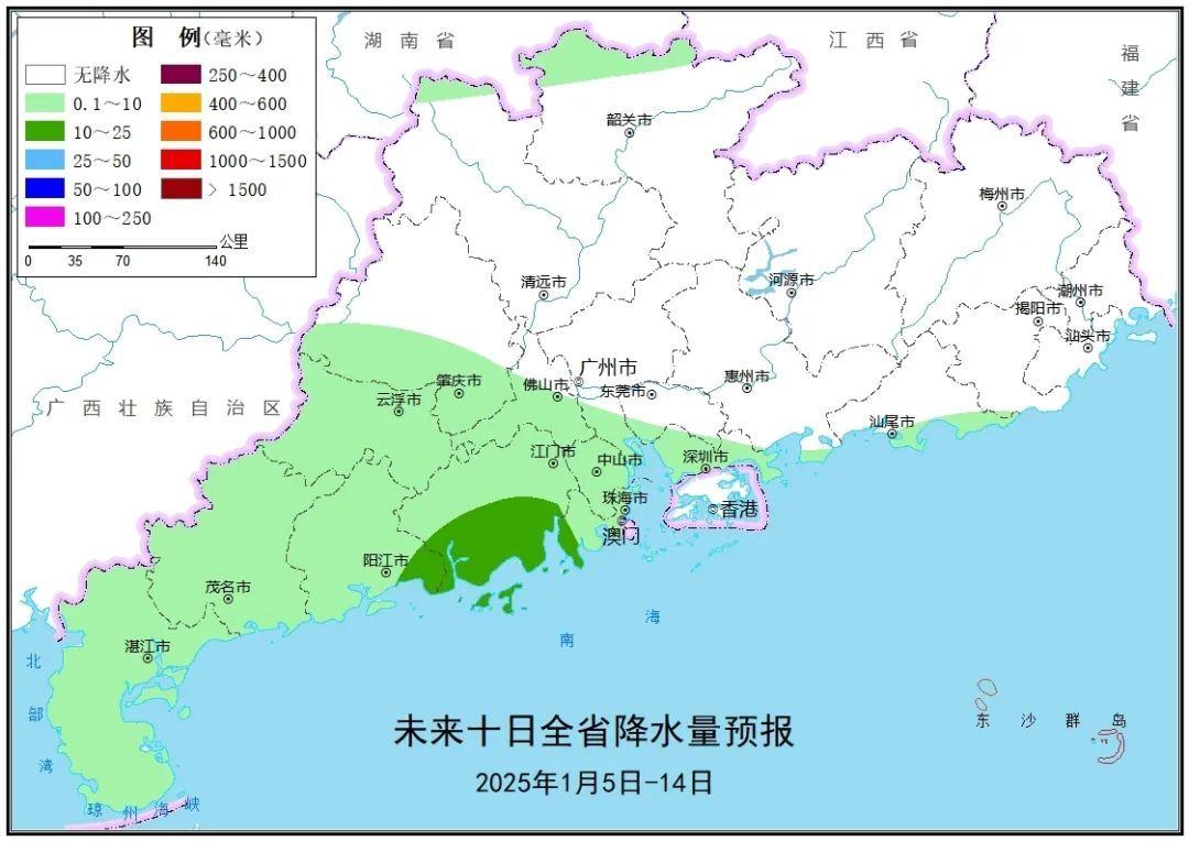 天气情况方面,未来10天(1月5日—14日)我省大部地区以晴朗干燥天气为主,粤东西南部、粤北西南部和北部、粤西大部、珠三角东南部和西部等地有分散小雨。