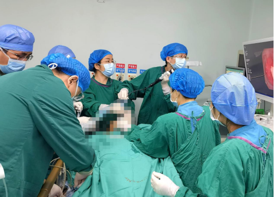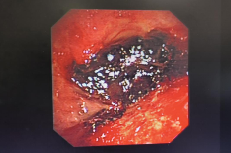 1月2日,手术在内镜中心进行。由于钊叔无法平卧,只能右侧卧位,大大增加了麻醉难度。经过麻醉科刘洪珍主任充分且审慎的诱导镇静麻醉后,手术正式开始。手术由张培芳主任、魏晓群副主任医师共同进行。当纤支镜探进气管,一个巨大的暗黑色的团块堵塞气管暴露无遗——这就是导致钊叔无法呼吸的“元凶”!