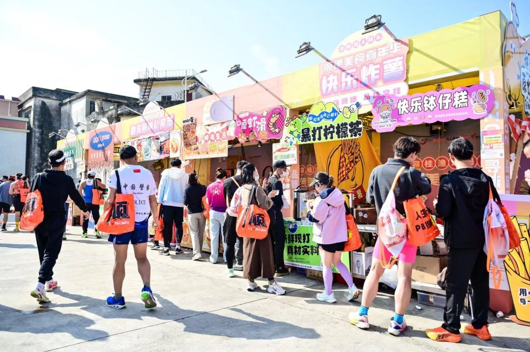 值得一提的是,赛道沿线设置了不少美食补给点,终点为顺德美食嘉年华,跑友们可免费品尝,堪称“最好吃的马拉松”,充分彰显世界美食之都顺德、中华美食名镇容桂的美食吸引力。趁着跑马的机会,全马男子冠军跑友王佩林与朋友在容桂开启了一段寻味之旅,“和朋友一同庆祝,品尝顺德美食,微醺一下!”