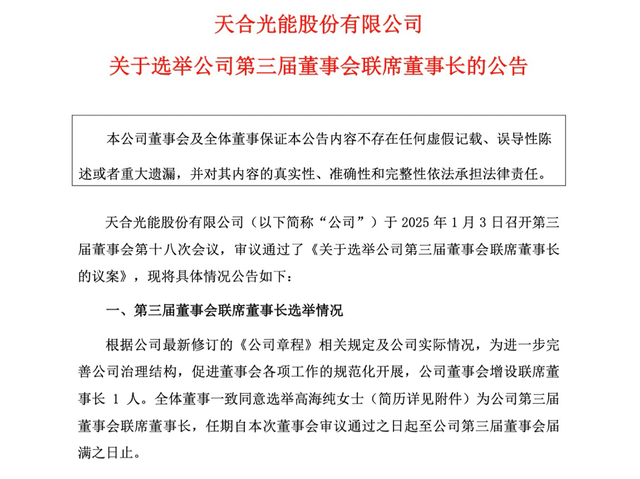 在天合光能1月4日发布的公告里,公司称公司联席董事长高海纯将兼任公司解决方案事业群总裁,领导公司由光伏产品制造商向光储智慧能源解决方案服务商转型,助力公司构建差异化竞争优势。同时,高海纯担任公司联席董事长后,将协助董事长开展董事会日常工作。