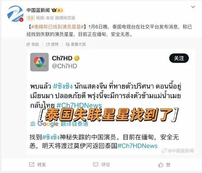 1月6日晚,泰国电视台在社交平台发布消息,称已经找到失联的演员星星,目前正在缅甸,安全无恙。