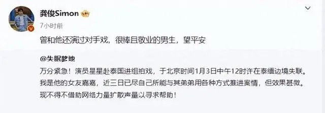 1月5日晚,微博账号“失眠爹地”发文称,其男友“星星”(王星)是一名演员,日前赴泰国拍戏,于北京时间1月3日中午于泰缅边境的湄索县失联。