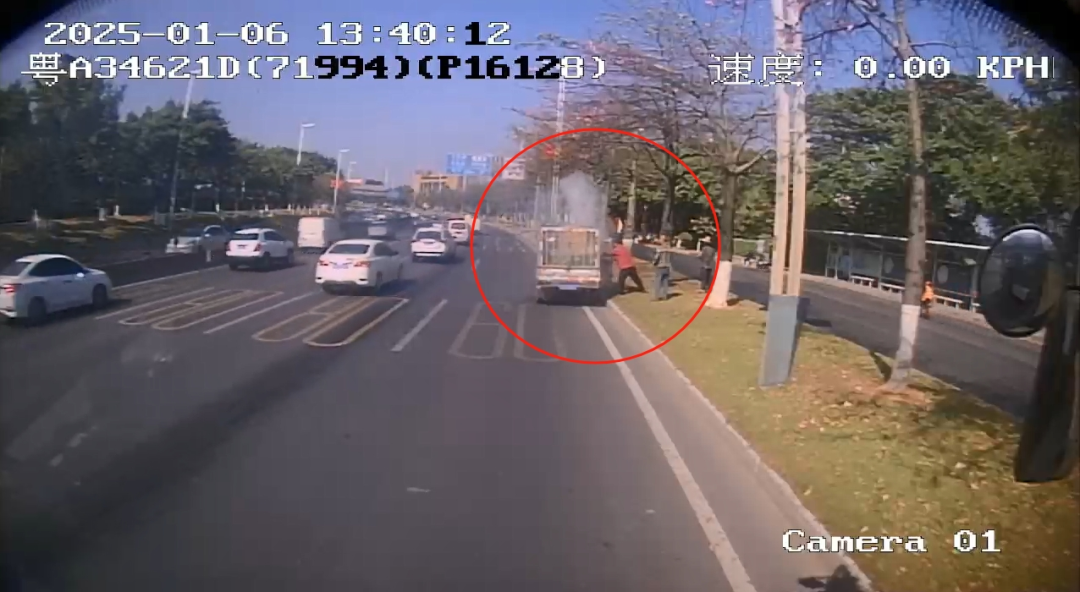 1月6日,一辆满载货物的小货车在路边冒出浓烟、随后燃起明火,广州巴士集团番南片区如约线路车长黄才明看到后,立即拎着灭火器冲上前扑救,控制住火情。