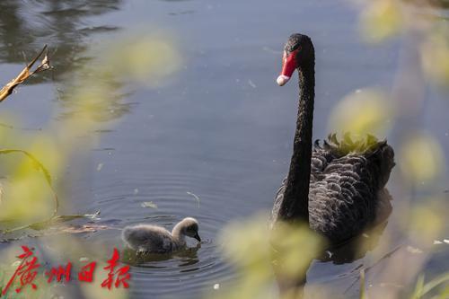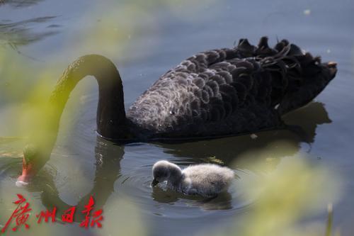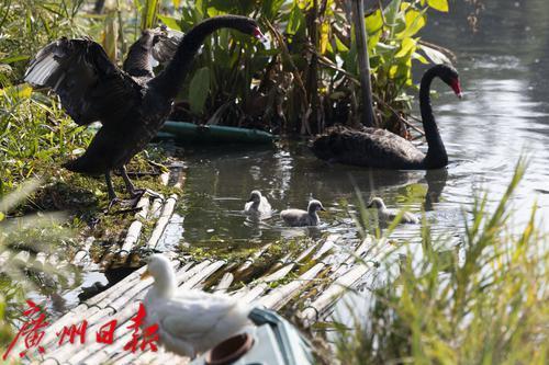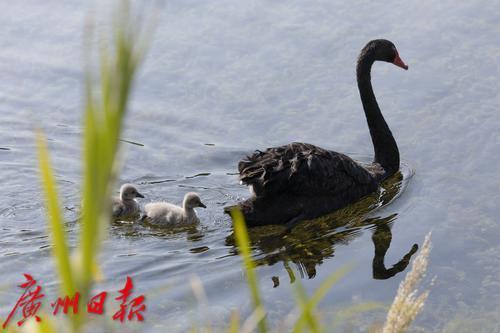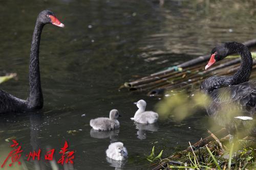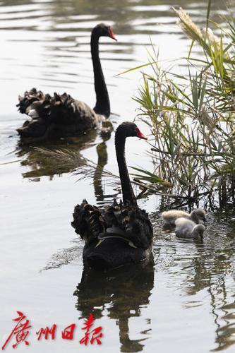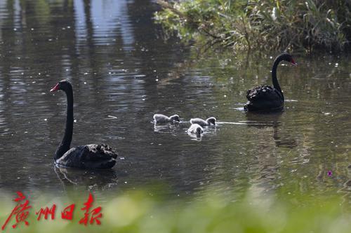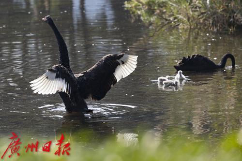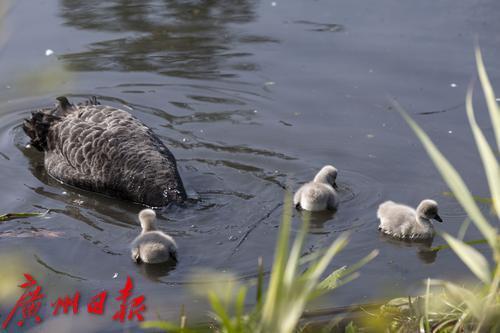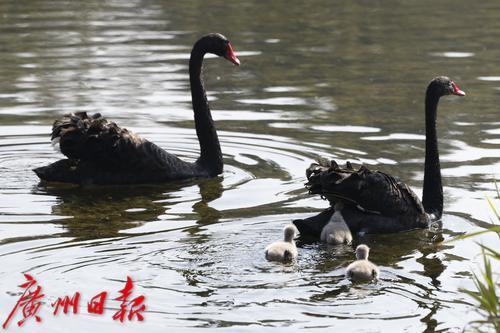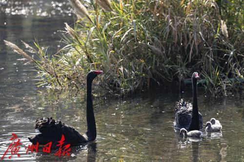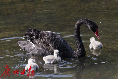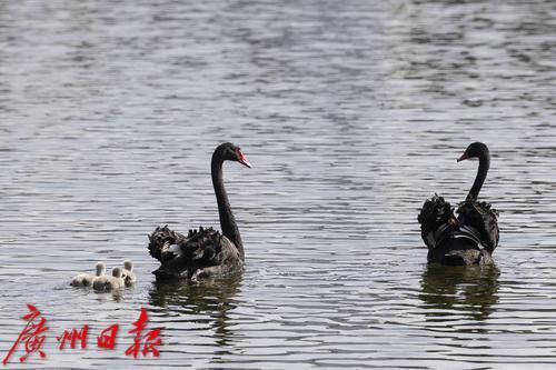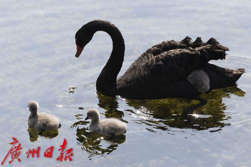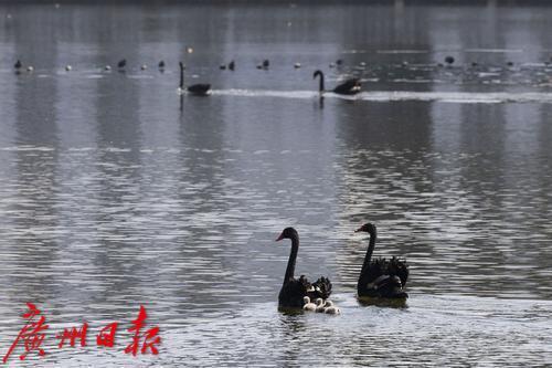 2025年1月7日,广州市流花湖公园,在冬日暖阳的照耀下,黑天鹅夫妇带着三只毛茸茸的小宝贝在波光粼粼的湖面中游水、嬉戏。小家伙们活泼可爱的样子,吸引了游人驻足观看,不少摄影发烧友端着“长枪短炮”拍摄天鹅宝宝可爱的身影。