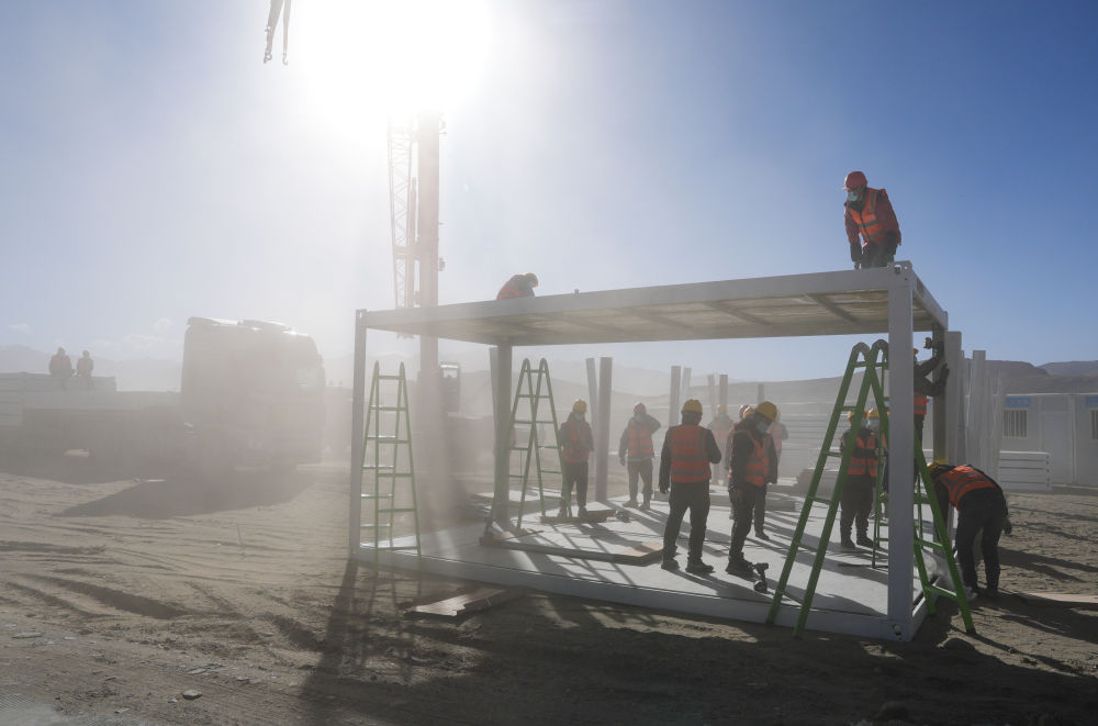 1月9日,一批活动板房在定日县长所乡森嘎村安置点安装。 新华社记者晋美多吉 摄
