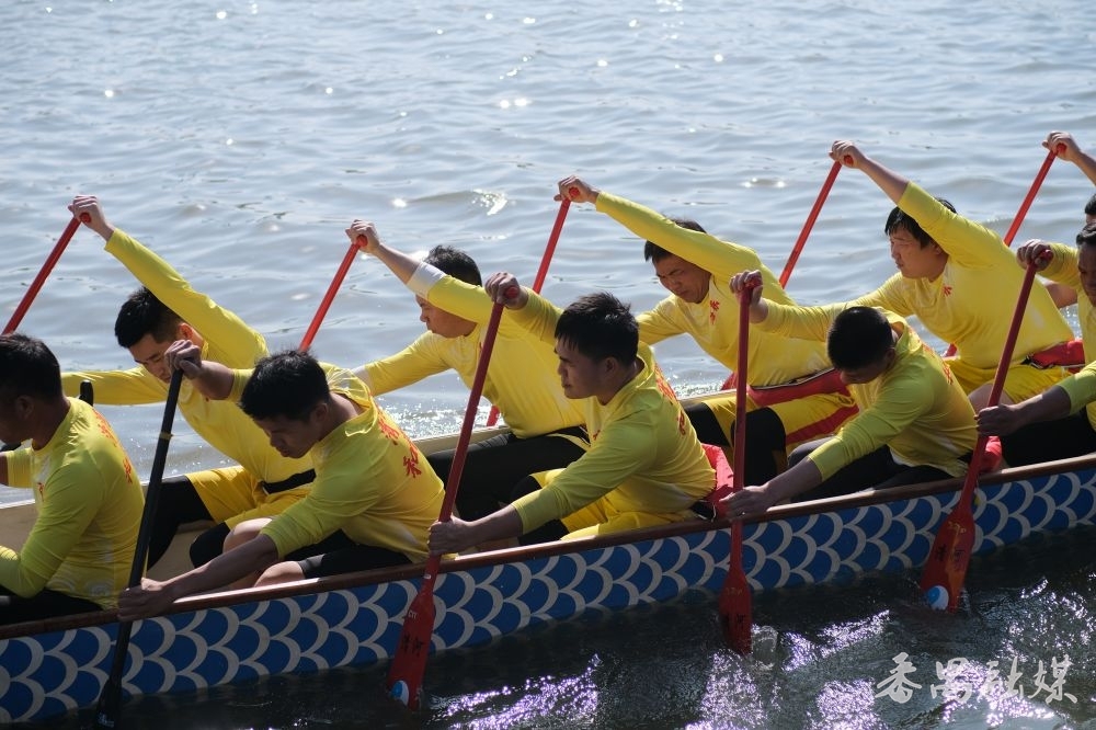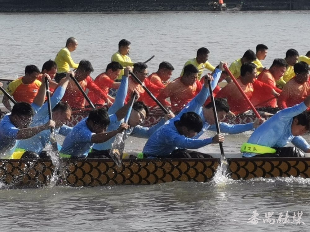 当天设置的比赛项目为300米往返赛,约110名运动员参赛。发令枪响,三支队伍迅猛疾驰,划动节奏明快有力,现场船桨翻飞、浪花四溅,考验队伍的默契和对龙舟的掌控程度。经过三轮角逐,最终由毬山清河和谐队夺得第一名。