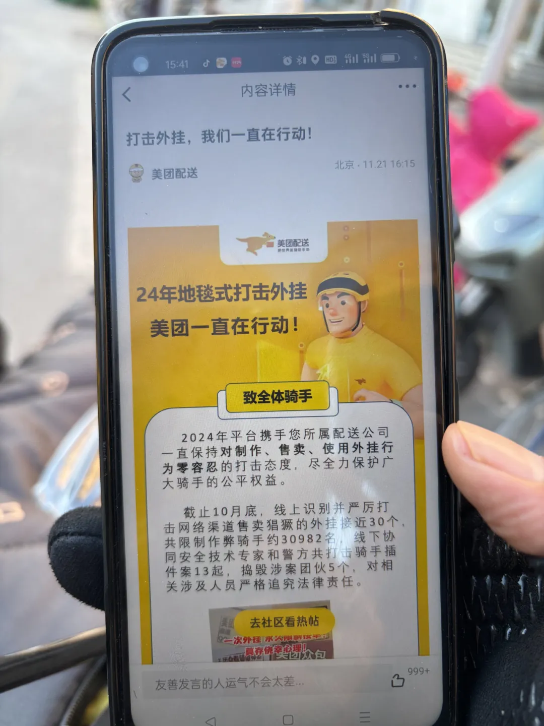记者通过骑手App看到,美团外卖在去年底例行骑手沟通中通报,2024年4月、5月、7月、9月分别配合公安机关打击了多个非法外挂团伙,对30982名使用外挂作弊的骑手进行了账号限制管控,保障骑手公平权益。美团还表示,将持续严查各种使用外挂等违反规定行为,杜绝使用第三方辅助工具获取订单,包括但不限于软件类抢单外挂和外设类物理点击器,开通24小时举报通道,鼓励骑手进行实时反馈和举报。