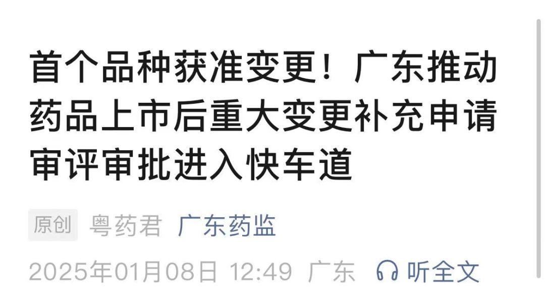 广东省药监局官方微信公众号“广东药监”今日发布消息称:1月6日,广东东阳光药业股份有限公司的利格列汀片的药品上市后重大变更获得国家药监局批准,补充申请审评审批极大提速,成为广东首个经前置服务后获得补充申请批件的品种。