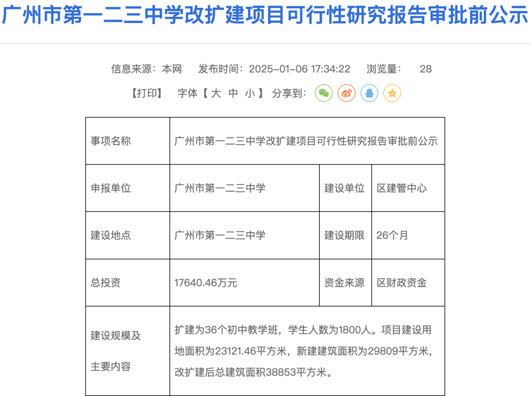 其中,广州市黄埔区门户网站在1月6日发布《广州市第一二三中学改扩建项目可行性研究报告审批前公示》。根据此次公示,广州市第一二三中学的办学规模将扩建为36个初中教学班,学生人数为1800人。项目建设用地面积为23121.46平方米,新建建筑面积为29809平方米,改扩建后总建筑面积38853平方米。