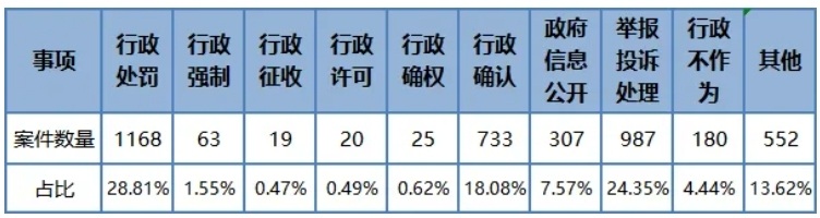 案件类型方面,新收案件涉及行政处罚、举报投诉处理、政府信息公开、行政强制、行政不作为等事项,其中行政处罚、举报投诉处理、行政确认占比较多,三类申请约占总数的70%;从类别上看,市场监管、公安、人力资源和社会保障三类案件位居前三,分别占比27.69%、27.36%、15.3%。