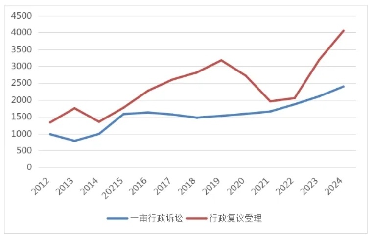 佛山2012-2024年行政复议、行政诉讼收案对比