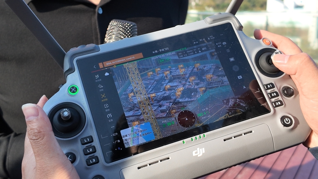 在媒体沟通会现场,记者还体验了Matrice 4系列无人机的飞行。在模拟高空作业监测任务中,记者通过遥控器屏幕观察到,无人机在高空中即时、准确地识别了所有在建楼房上的高空作业人员,并实时监测到了他们的头盔佩戴情况。这一功能将有效提高了工地安全监管的效率。