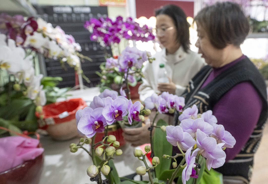 顾客王阿姨拖着一辆小车,车中已有几束腊梅和观音竹。她又来到了卖兰花的档口,一边问价一边精心挑选着心仪的花。她告诉记者,她经常会来花卉市场选购一些花卉,这也是她日常生活的乐趣之一。“现在快过年了,也是为了给家人带去一份美好的祝福。”王阿姨说。