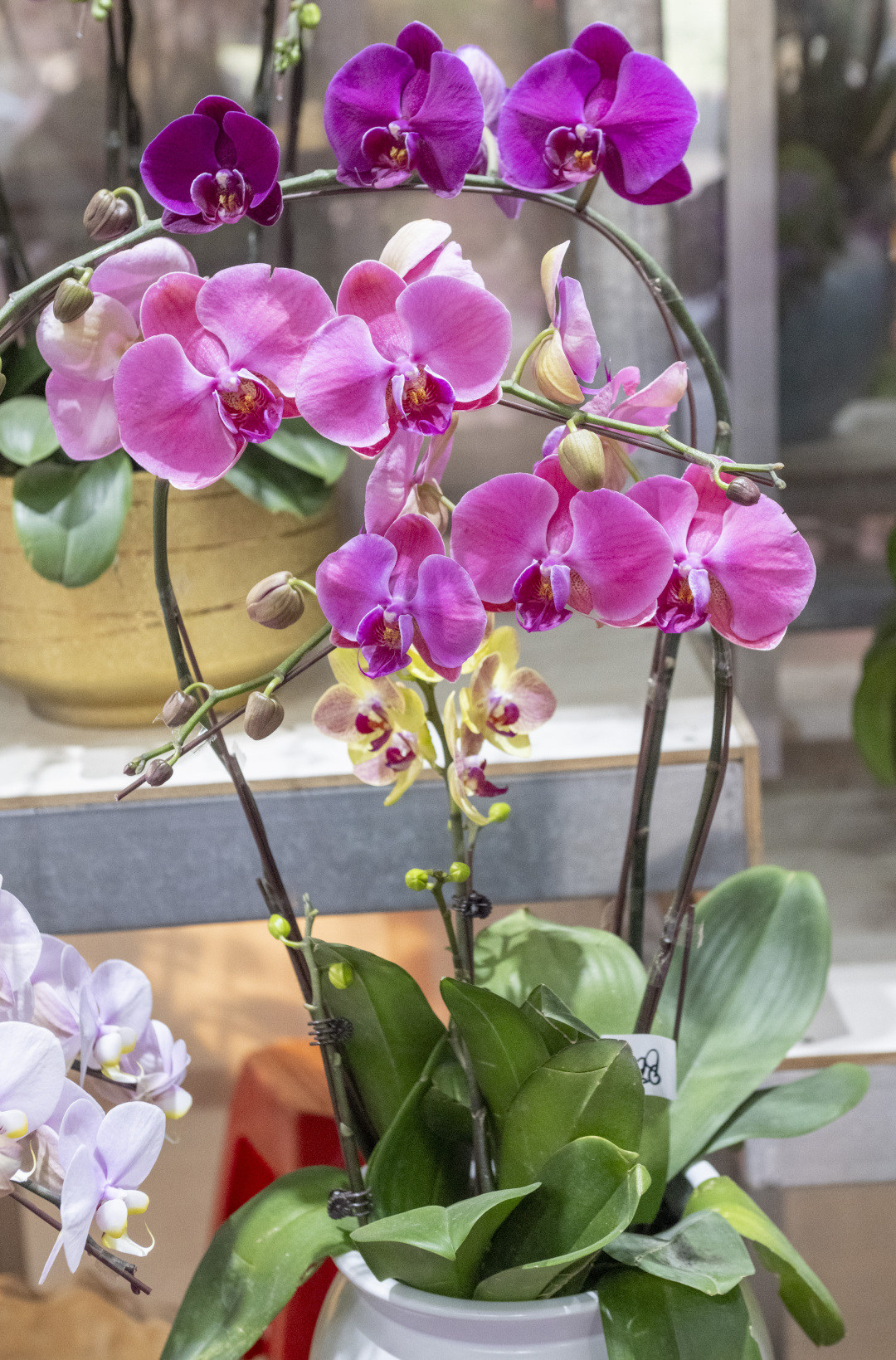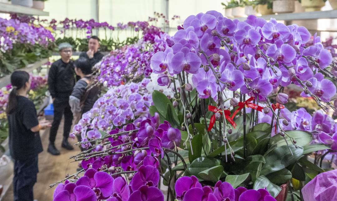 以市场内的满天红园艺店为例,其售卖的蝴蝶兰多达百余种,包括大辣椒、藏宝图、大财主、黄冠、法国斑等品种,往年单枝价格在28元到35元之间,今年略微便宜了一两元。“今年春节比较早,我们尽量早上货。现在基地80%的货都上架了,批发渠道的出货量已占了总货量的六成。”店长莫小丽一边忙碌一边介绍。她告诉记者,蝴蝶兰的年轻受众变多了,马卡龙、幻影、米歇尔、雪山飞狐等颜色清新的品种十分受年轻人欢迎,“蝴蝶兰适合在8到30摄氏度的环境生长,花期长,不用怎么养护,是典型的‘懒人花’。”记者在店内看到,去年龙年面市、受到追捧的高端蝴蝶兰品种龙兰,今年依旧是主打款,一枝有16到18个花苞的龙兰售价在300多元。