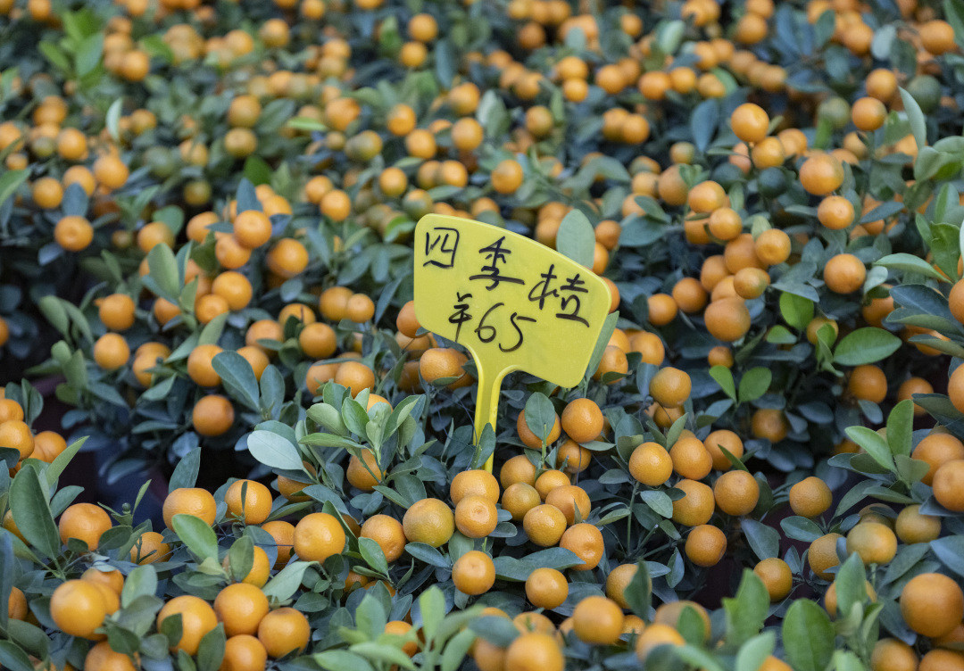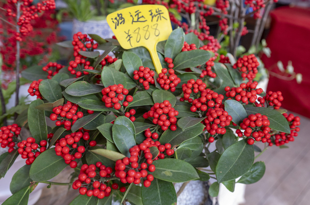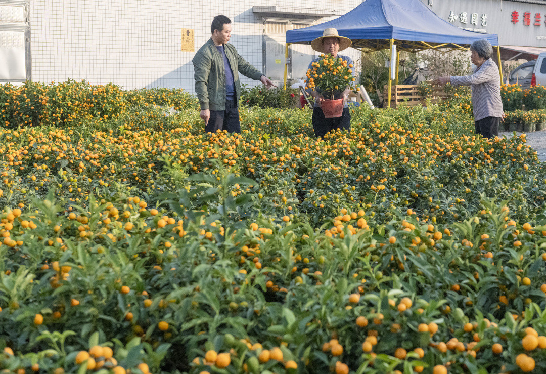 “挑年桔要趁早!买得越早越漂亮,到后面好的都被挑完了。”一位陪同老母亲挑选年桔的先生告诉记者,随后两人仔细挑选了一盆树形优美的四季桔装车带回家。作为年宵花中主打品种之一,年桔以金灿灿的外形、“大吉大利”的寓意,深受市民喜爱,其种类繁多,包括金桔、四季桔、金蛋果、朱砂桔,价格丰俭由人,从数十元到千元不等,而且果期较长、好养护。在岭南花卉市场内外,各式年桔已批量上线,时不时可见一片金黄,十分喜庆。“今年年桔的价格涨了,起码涨了2/3,部分甚至价格翻倍。以小盆的金桔为例,往年只需30多元,现在要五六十元。”岭南花卉市场经理何永表示,这与顺德、番禺等地今年种植规模减少有关,“不过,今年的桔果成熟期正好在春节期间,现在还有一点青,到过年就会是恰到好处的金黄。”