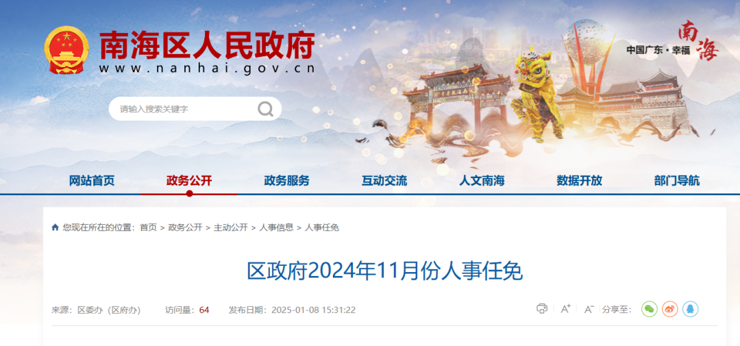 2025年1月8日,佛山市南海区人民政府网发布了最新一期人事任免信息。