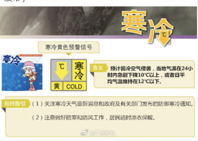 广州市气象台在今天15时30分发布了今年首个寒冷黄色预警信号。截至1月9日19:00,广州越秀、天河、黄埔、白云、花都、增城已发布寒冷黄色预警,从化升级至寒冷橙色预警。这是广州今年发出的首个寒冷预警,也是广州市区相隔323天后再次发布寒冷预警。去年入秋后来了好些冷空气,市区都没发布寒冷预警,这次降温大家还是要小心在意,适时增减衣物。
