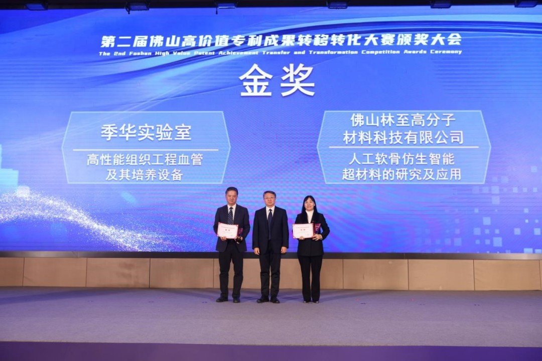 本届大赛自2024年9月启动后,参赛规模创下新高,共有来自北京科技大学、华南理工大学、广东省科学院化工研究所、季华实验室等全国重点高校院所以及众多知名企业的800个高价值专利成果项目报名参与,所涉专利超1600件,技术涵盖生物医药与健康、高端装备制造、智能机器人、新一代电子信息、新材料(技术)、新能源、佛山传统优势产业和未来产业等领域。历经近三个月的角逐,最终16个项目脱颖而出获得金、银、铜奖项荣誉以及4至20万元不等的奖金。其中,季华实验室的“高性能组织工程血管及其培养设备”、佛山林至高分子材料科技有限公司的“人工软骨仿生智能超材料的研究及应用”分别斩获初创组、成长组金奖。