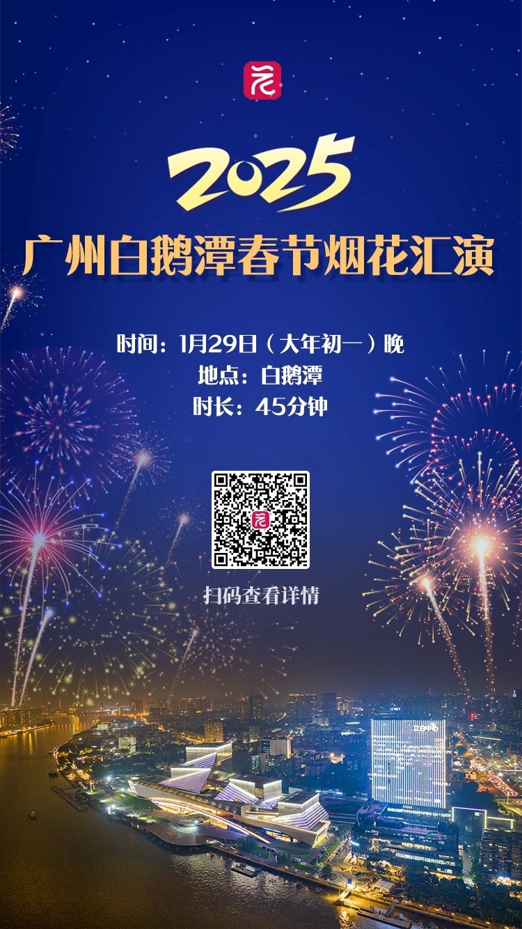 【正式官宣!大年初一晚八时,广州春节烟花汇演再度绽放白鹅潭】2025年广州白鹅潭春节烟花汇演将于1月29日(大年初一)晚上8时举办,活动时长45分钟。此次活动以白鹅潭大湾区艺术中心为烟花背景,融入了2025架无人机表演等内容,将继续实行预约制观演。详情>>