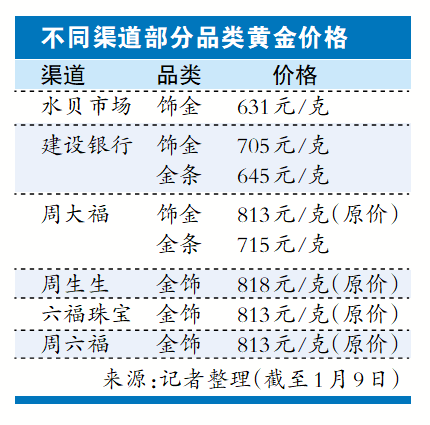 而相比批发市场和银行,品牌金店的金价无论线上线下仍旧欠缺价格优势。如1月9日当天,水贝黄金价格仅为631元/克,建设银行的部分黄金首饰克重价格约为698~708元/克不等,均低于品牌促销价。