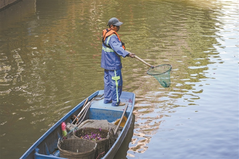 记者赶到荔湾区驷马涌,远远地,就望见涌上有一名保洁员站在小船上,拿着竹竿,来回打捞涌面的花瓣和落叶。