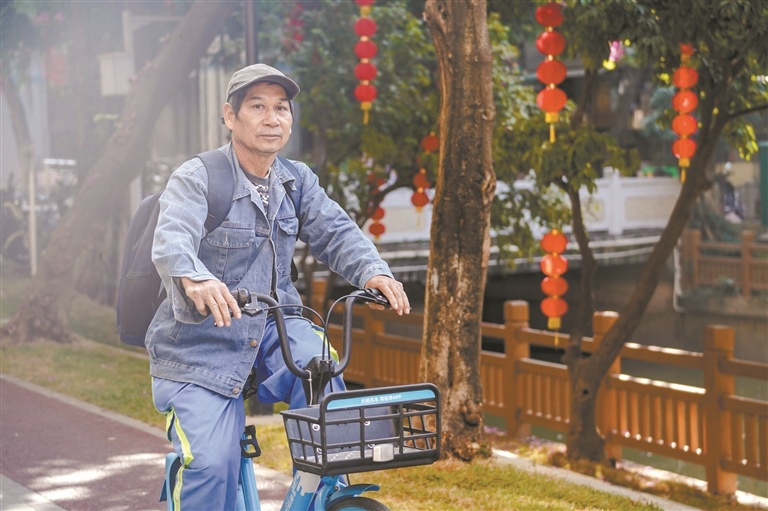 谢全喜欢骑自行车,每逢上下班,他都会戴着他那标志性的帽子、穿着灰色夹克,骑着共享自行车,在河涌边上来来回回。
