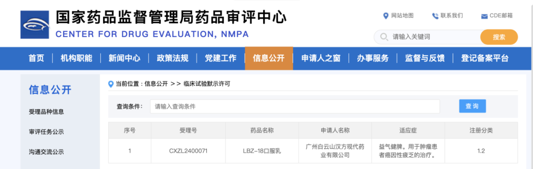 2025年1月8日,据国家药品监督管理局药品审评中心官网显示,白云山汉方自主研发的1.2类中药创新药“LBZ-18口服乳”正式获得药物临床试验批准,适应症为益气健脾,用于肿瘤患者癌因性疲乏的治疗。这是全球首个“治疗肿瘤患者癌因性疲乏”1.2类中药创新药临床试验批件。