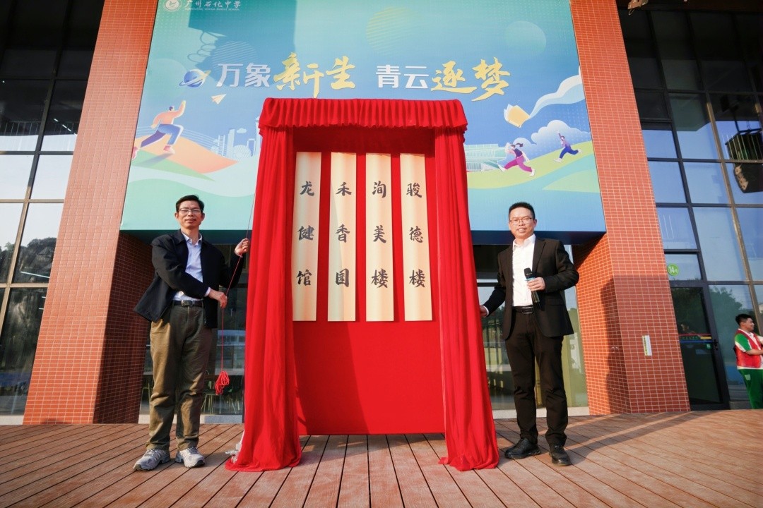 去年12月,广州石化中学还举行了楼宇征名大赛。新楼启用仪式上,李军广宣读了此次征名大赛的获奖名单,并为获奖者贺喜颁奖。李军广还与学校副校长钟才城拉开新楼名红幕,体育馆“龙健馆”、食堂“禾香园”、女生宿舍“洵美楼”和男生宿舍“骏德楼”出现在大家面前。