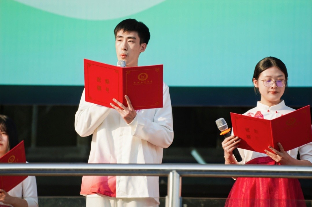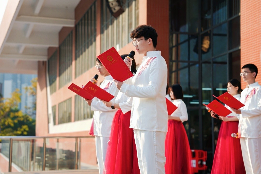 启用仪式上,学校师生用歌舞表演、朗诵等多种形式,表达了对新楼的热爱和期待。其中,桂湛老师指导高二年级的钟宁、周锐豪和王修扬同学演绎了《千山万水》。青年教师朗诵队朗诵了黄政老师执笔的《石化组歌》。黄政老师通过其创作的诗赋,向人们介绍石化中学建校至今的历史变迁,传递出老一辈石化人对教育事业的虔诚与热爱。青年教师唱响铿锵的颂歌,展现了新一代年轻教师对石化中学未来的期许与追求。