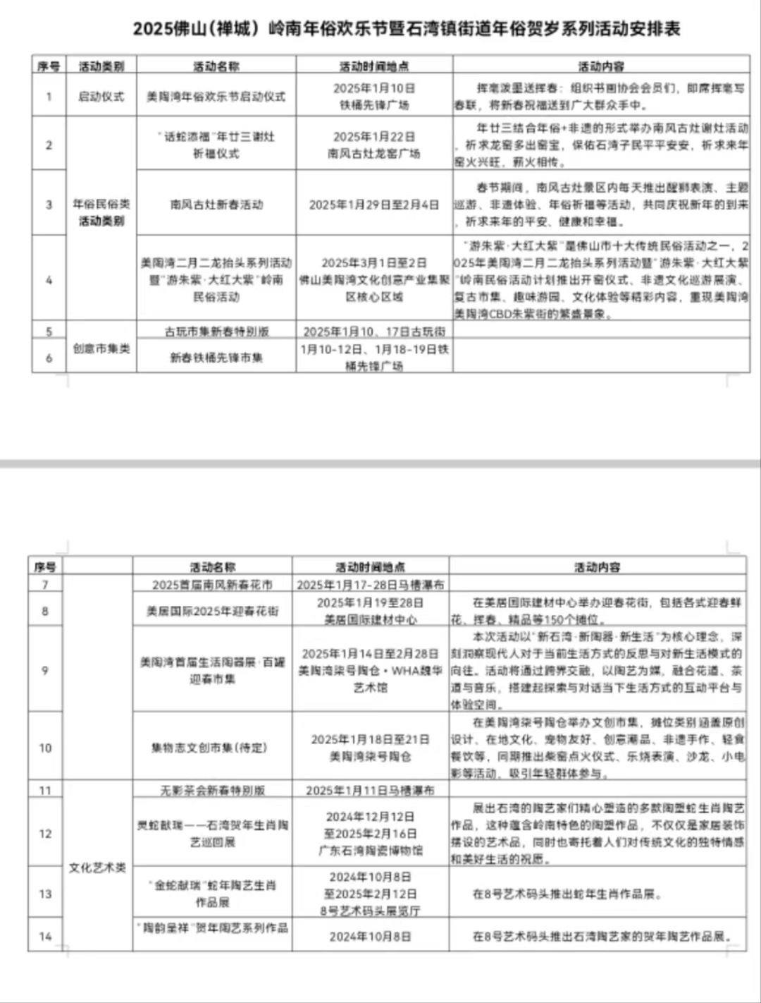 接下来,2025石湾镇街道年俗贺岁系列活动将传统年俗文化与时尚消费、创意设计、文旅体验相融合,为市民和游客带来一场丰富多彩的文化盛宴,既是对石湾镇深厚历史文化的传承,也为其注入了新的活力。