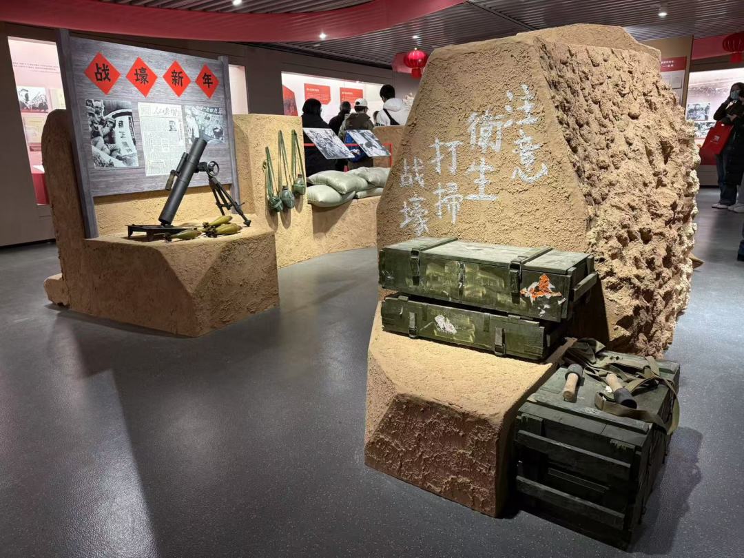 展厅二楼打造了复原战壕展项,并在战壕当中特设了战地新年场景,展现了人民解放军积极昂扬的革命乐观主义精神。在战壕旁边,搭建的民工支前工作站中展示了支前干部学习教材和支前民工奖状奖章,充分印证了我们党带领和统筹规划下组织严密、协同密切的支前队伍建设工作,“数十万劳动人民的组织和指挥,逐渐形成系统和秩序,这是一门巨大精深的组织科学”。