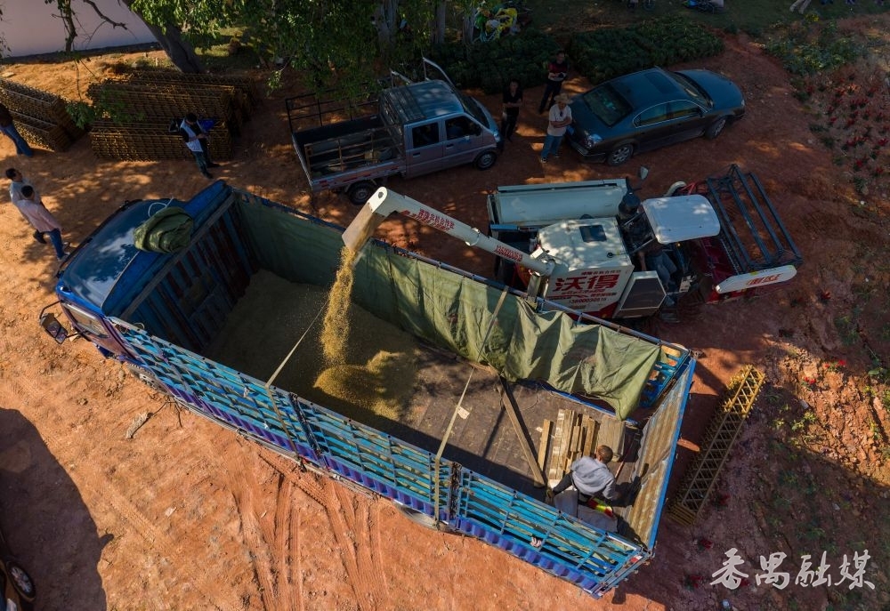 收割机正在卸谷
