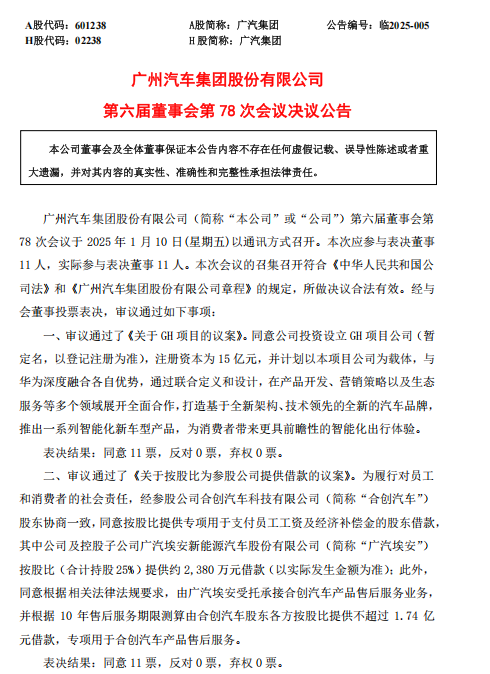 广汽集团在公告中称,为履行对员工和消费者的社会责任,股公司合创汽车科技有限公司股东协商一致,同意按股比提供专项用于支付员工工资及经济补偿金的股东借款,其中公司及控股子公司广汽埃安新能源汽车股份有限公司按股比(合计持股25%)提供约2380万元借款(以实际发生金额为准)。