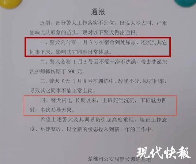 该通报最后“希望上述警犬及训导员引起高度重视,端正工作态度,迅速整改,以全新的状态投入到新一年的工作中。”