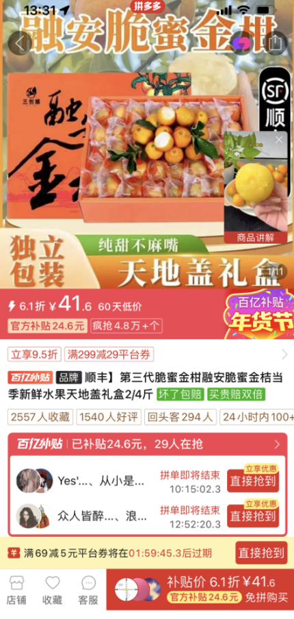 不久前,拼多多启动2025年年货节,肖友菊旗下网店的脆蜜金桔也很快入选。在百亿补贴的加持下,这些个大味甜的金桔也成为年货节期间的顶流水果,日订单量很快突破四位数。