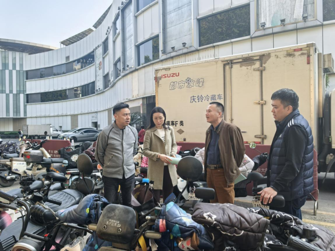 首先,人大代表们到太阳城商业广场、京溪南方医院地铁口、圣地擎山农贸市场等进行暗访调研,实地了解电动自行车停放与充电情况,全面深入查找存在问题。暗访过程中,人大代表们发现圣地擎山农贸市场档口内飞线充电及乱停放情况较为严重,现场对违反规定行为给予劝导、教育、警告、责令恢复原状。