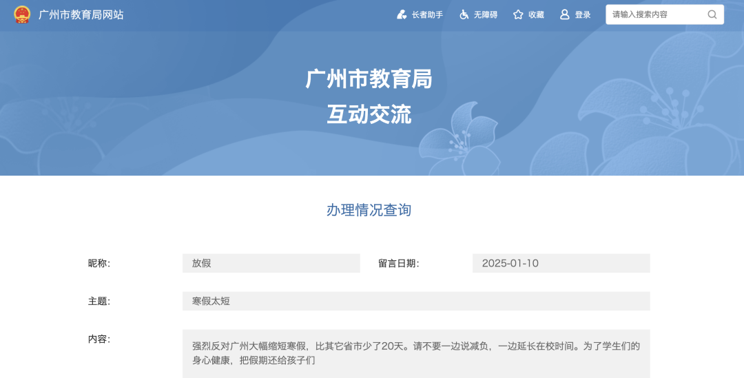 近日,有市民在广州市教育局官网留言反映“寒假太短”,称“反对缩短寒假”,希望“为了学生们的身心健康,把假期还给孩子们”。