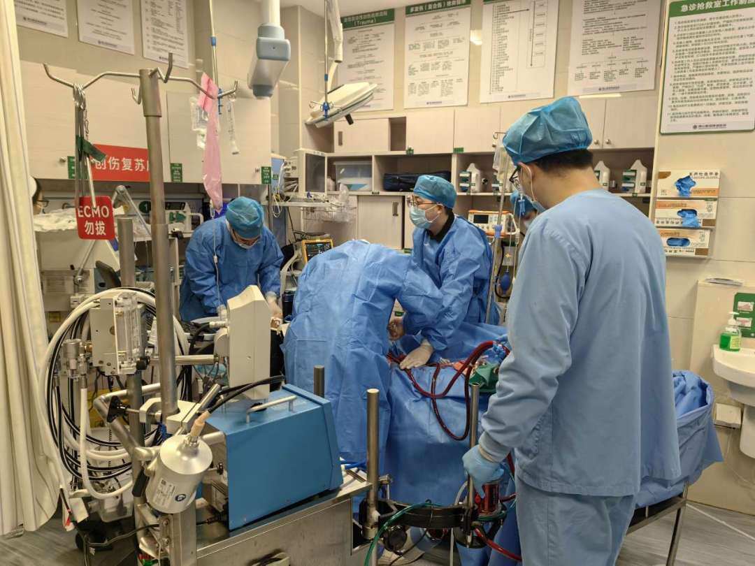 心脏复苏的黄金时间是4-6分钟,在张海斌、郭绣琴、彭全全3位医护接力施救的时候,佛山禅医救护车于8:05也赶到现场,急诊医护人员立即上前查看大爷情况并持续进行胸外心脏按压和除颤,一系列抢救忙而不乱。到达急诊科抢救室内,一场多学科协作(MDT)的生命救援行动迅速展开。急诊抢救团队持续规范的心肺复苏20分钟后,大爷仍未恢复自主循环,为了救李大爷的生命,8:53分ECMO团队决定启动ECMO(体外膜肺氧合)进行救治。9:29分成功上机,ECMO将血液从李大爷体内引出,经氧合器后,暗红色的血液变成鲜红色,回输到他体内,很快大爷心跳恢复,为后续的治疗争取了时间与机会。