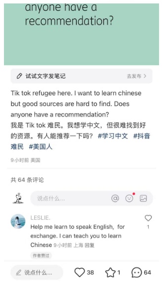 大批“TikTok难民”的涌入,也开启了小红书“英语角”这一新功能。无论是希望学习中文的外国用户,还是想提升英语水平的中国用户,都有机会在这里找到“语言搭子”。