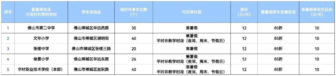 第二批纳入闲时共享的学校有佛山市第二中学、文华小学、张槎中学、绿景小学和华材职业技术学校(本部)。根据安排,文华小学、绿景小学、华材职业技术学校(本部)可在寒暑假及平时非教学时段(长期)进行学校配套停车场闲时共享,届时购买寒暑假共享卡的用户可优先购买平时共享卡。