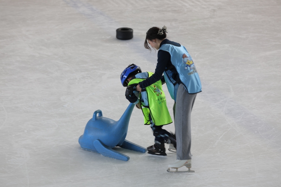 在滑冰体验环节,志愿者们纷纷大显身手,为孩子们奉上精彩的花滑、速滑表演。这些志愿者中有专业的花滑教练、冰球教练,还有来自异国他乡的外国友人,他们不仅拥有高水平的滑冰技术,更怀揣着对孩子们的关爱和责任感。在家长、老师的鼓励以及志愿者们的耐心辅助下,孩子们勇敢地迈出了尝试的步伐。尽管过程中不乏跌倒与挫折,但孩子们始终坚持不懈,冰面上的笑声与加油声此起彼伏,构成了一幅幅温馨而动人的画面。