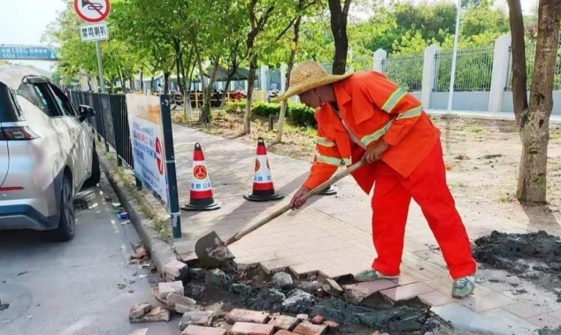 在修复现场,剑岭道班施工人员在修复路口周边拉起警戒线进行围蔽,提醒过往行人注意施工安全。随后施工人员清除人行道松动的砖块和杂物,并参照人行道的初始设计和对应规格,挑选合适的砖块进行铺设。同时施工人员用专业工具切割破损路基,再填充沥青材料,压实和平整路面,确保路面符合行走习惯设计又美观耐用。