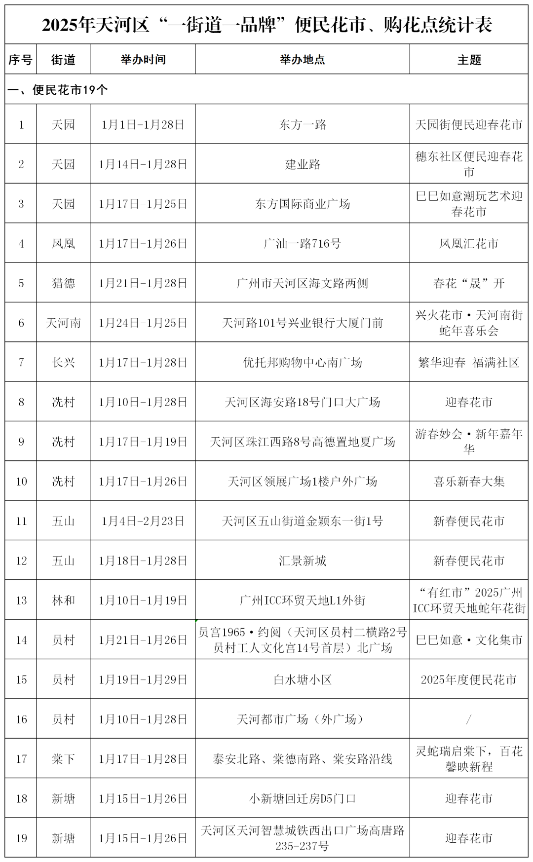 蛇年新春至,花街添新彩。2025年广州天河区迎春花市的主会场设在天河区奥体南路12号优托邦,迎春花市开放时间为2025年1月25日至27日(每日的开市时间为8:30至24:00)、1月28日8:30至29日凌晨2:00。