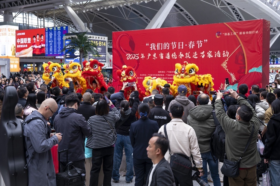 今天,广州南站在三层候车室举办春运首日系列文化活动,喜迎春节氛围浓厚。“回家的路,就是最美的风景”春运誓师动员大会,彰显铁路人保障旅客平安、有序、温馨出行的不变承诺。“我们的节日·春节”2025年广东省道德春联进万家活动现场,艺术家现场演唱《中国喜洋洋》《老百姓最美》等欢快喜庆歌曲。舞狮表演、杂技软功表演等节目的同时,16名书法家现场挥毫为旅客送上春联和福字,旅客喜气洋洋踏上回家的高铁。
