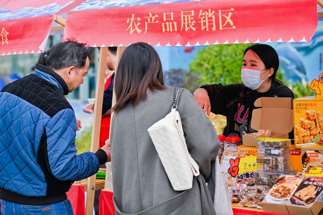 围绕“交农文旅商”融合发展主题,长沙湾服务区结合地域特色设置了“‘鲸’彩集市”,现场布置了“新春送福”“年味小吃”“农产品专卖”等5个专区共22个摊位。虾米、鱿鱼、汕尾菜粿、银屏蚝烙等地方特色农产品和小吃琳琅满目,热闹的“年味”和浓浓的“烟火气”吸引了不少旅客驻足挑选年货和土特产。