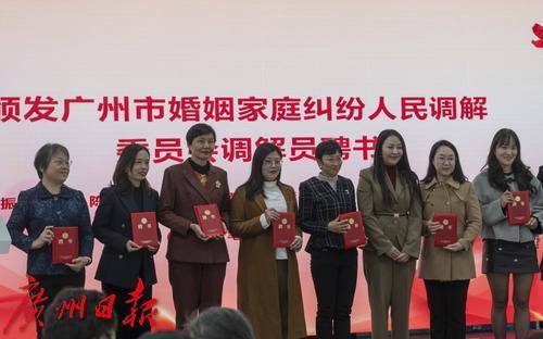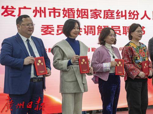 向广州市婚姻家庭纠纷人民调解委员会调解员颁发聘书。