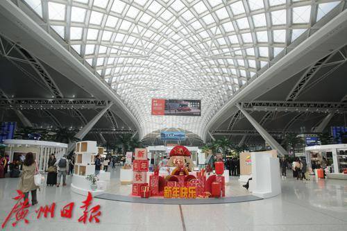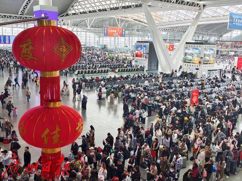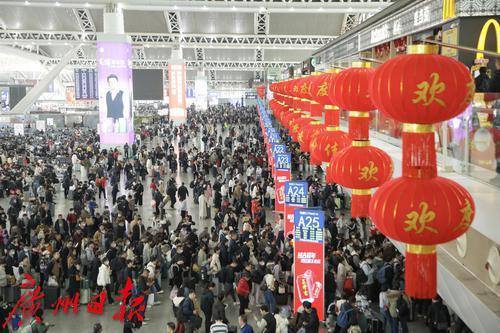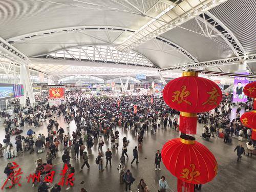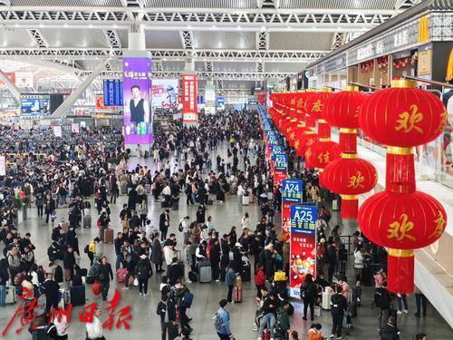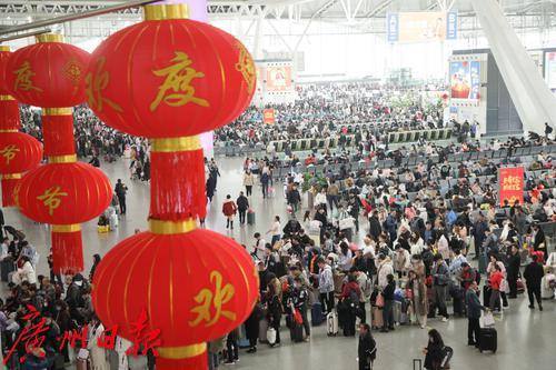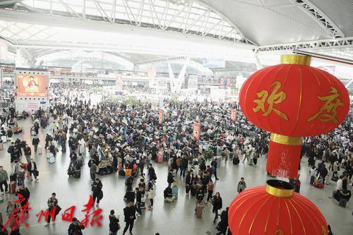 广州南站挂起了高高的红灯笼,大厅内秩序井然,旅客在排队候车。