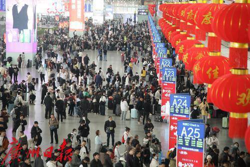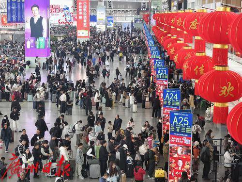 1月14日上午,广州南站挂起了高高的红灯笼,大厅内人头涌涌秩序井然,不少旅客踏上回家的列车。2025年春运于当日正式启动,广州南站预计在40天内到发旅客2016.8万人,日均50.4万人。节前高峰预计在1月22日至27日,节后高峰在2月1日至6日。
