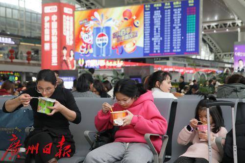 旅客在候车大厅吃方便面。
